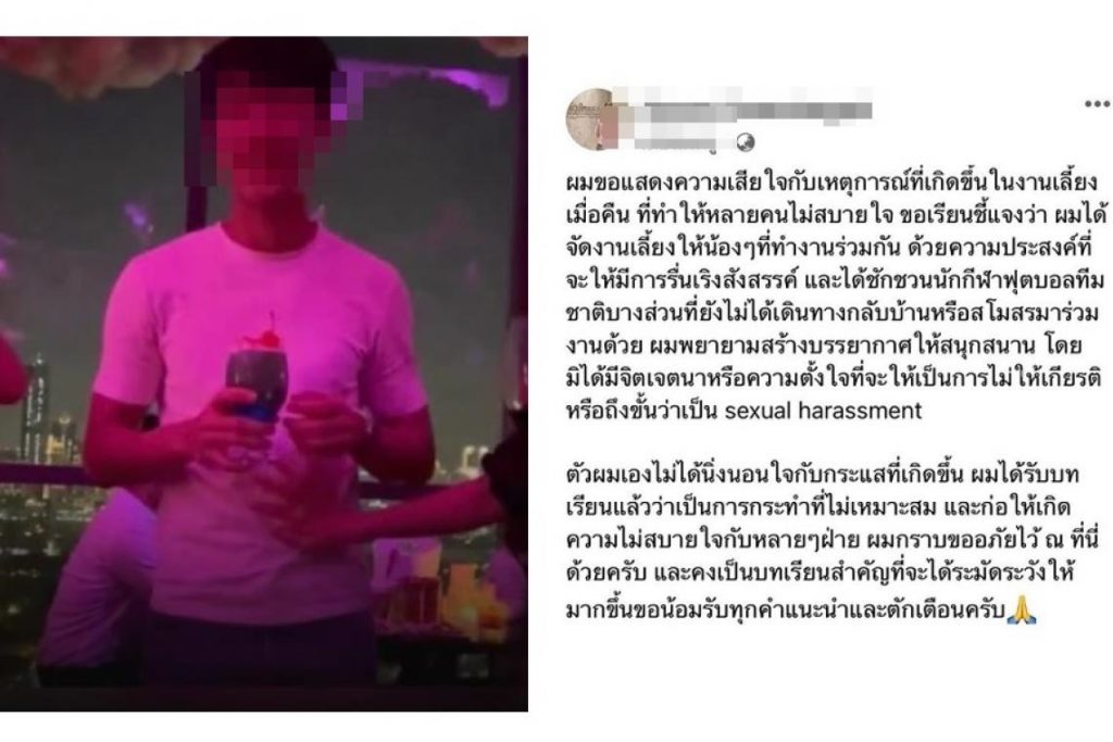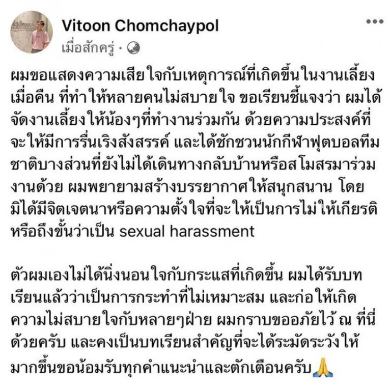 ล่าสุด นาย วิทูรณ์ ชมชายผล หรือ ตี๋ คนสนิทของผู้จัดการฟุตบอลทีมชาติไทย ได้ออกมาขอโทษเกี่ยวกับเหตุการ์ณดังกล่าวผ่าน Facebook โดยมีข้อความระบุ ว่า ผมขอแสดงความเสียใจกับเหตุการณ์ที่เกิดขึ้นในงานเลี้ยงเมื่อคืน ที่ทำให้หลายคนไม่สบายใจ ขอเรียนชี้แจงว่า ผมได้จัดงานเลี้ยงให้น้องๆที่ทำงานร่วมกัน ด้วยความประสงค์ที่จะให้มีการรื่นเริงสังสรรค์ และได้ชักชวนนักกีฬาฟุตบอลทีมชาติบางส่วนที่ยังไม่ได้เดินทางกลับบ้านหรือสโมสรมาร่วมงานด้วย ผมพยายามสร้างบรรยากาศให้สนุกสนาน โดยมิได้มีจิตเจตนาหรือความตั้งใจที่จะให้เป็นการไม่ให้เกียรติ หรือถึงขั้นว่าเป็น sexual harassment