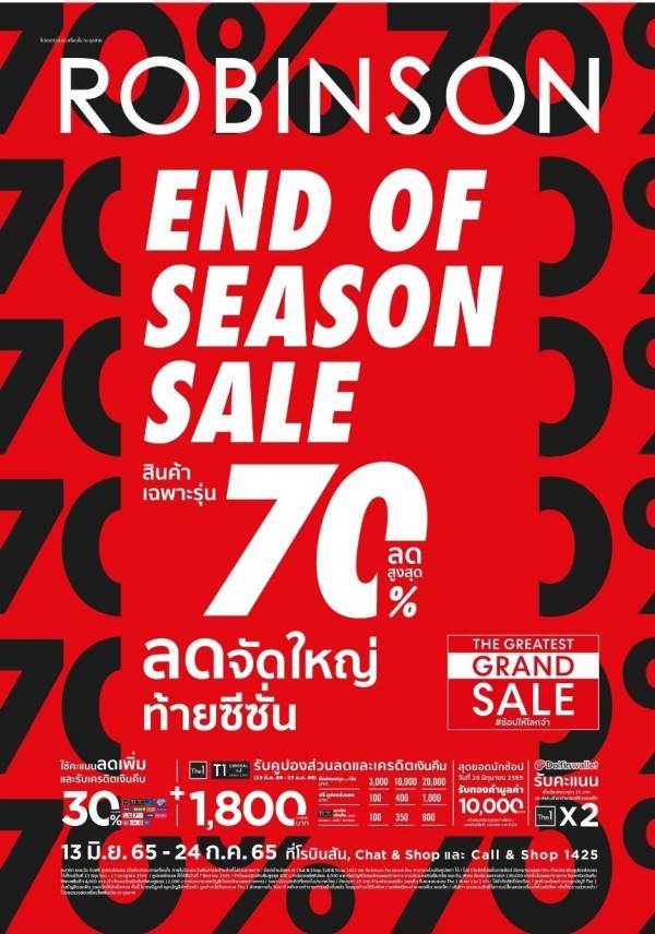 มาช้อปให้โลกจำ กับมหกรรมเซล “CENTRAL / ROBINSON END OF SEASON SALE” ที่ห้างเซ็นทรัล ทุกสาขา และห้างโรบินสัน ทุกสาขา (ยกเว้นสาขาจังซีลอน ป่าตอง) และช้อปสะดวกสบายตลอด 24 ชั่วโมง กับหลากหลายช่องทางการ ช้อปปิ้ง ทั้ง Central App เว็บไซต์ www.central.co.th บริการ Central / Robinson Chat & Shop แชทและช้อปสินค้าผ่านไลน์@Centralofficial และ @Robinson บริการโทรช้อปสินค้าCentral / Robinson Call & Shop และบริการ Personal Shopper On Demand ผู้ช่วยช้อปส่วนตัว โทร.1425 บริการพิเศษที่จะคอยให้คำแนะนำข้อมูลแก่ลูกค้าอย่างครบครัน หรือช้อปผ่านเฟซบุ๊คพร้อมติดตามข่าวสารเพิ่มเติมผ่านทาง Facebook Central Department Store และ Robinson Department Store