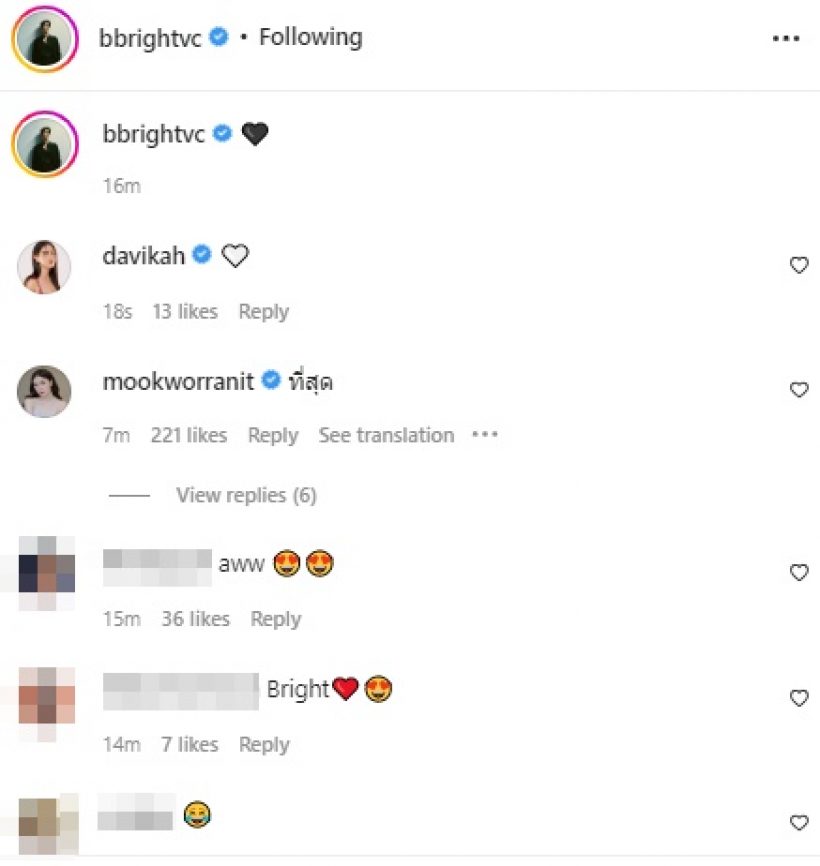 ล่าสุด ทั้งคู่ก็ปล่อยภาพคู่ที่ทำแฟนคลับหัวใจจะวาย น่ารักและเคมีเข้ากันจนแฟน ๆ หลายคนฟินหนักมาก เริ่มที่สาวใหม่โพสต์ภาพคู่ผ่านอินสตราแกรม @davikah พร้อมแคปชั่น มองบน ตามด้วย หนุ่มไบร์ท โพสต์ภาพคู่ผ่านอินสตราแกรม @bbrightvc โอบเอวและกอดมุ้งมิ้งหวานกว่าเซ็ตภาพสาวใหม่ พร้อมแคปชั่น อิโมจิหัวใจสีดำ และทั้งคู่ก็ผลัดกันส่งหัวใจให้กันผ่านไอจี งานนี้ทำเอาแฟน ๆ กรี๊ดลั่นเลยหล่ะจ้า