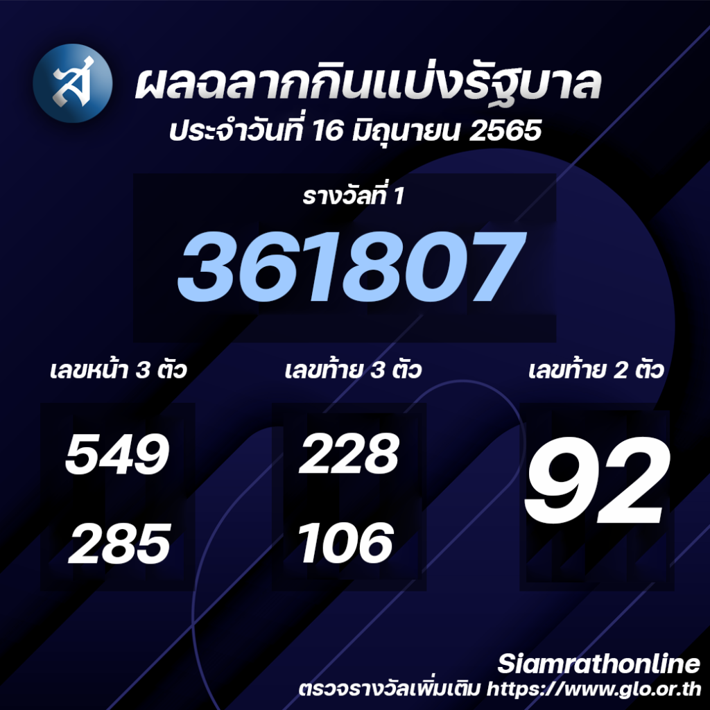 ผลสลากกินแบ่งรัฐบาล งวดวันที่ 16 มิถุนายน 2565