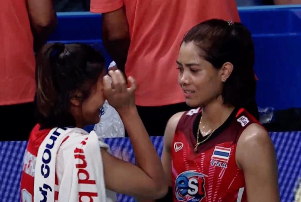 “บีม” พิมพิชยา ก๊กรัมย์” นักตบสาวดาวรุ่งทีมชาติไทย ร้องไห้เดินไปหา อัจฉราพร คงยศ เนื่องจาก ลงสนามนัดที่สองแพ้ให้กับ โปแลนด์ ทีมอันดับ 11 ของโลก 2-3 เซต 25-22, 29-27, 16-25, 16-25 และ 13-15 ที่เมืองเกซอน ซิตี้ ประเทศฟิลิปปินส์