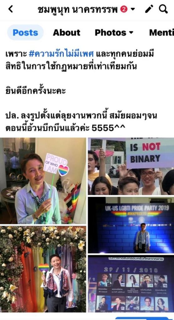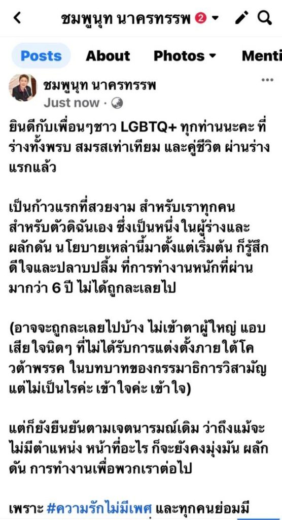 “ยินดีกับเพื่อน ๆ ชาว LGBTQ+ ทุกท่านนะคะ ที่ร่างทั้งพรบ สมรสเท่าเทียม และคู่ชีวิต ผ่านร่างแรกแล้ว เป็นก้าวแรกที่สวยงาม สำหรับเราทุกคน สำหรับตัวดิฉันเอง ซึ่งเป็นหนึ่งในผู้ร่างและผลักดัน นโยบายเหล่านี้มาตั้งแต่เริ่มต้น ก็รู้สึกดีใจและปลาบปลื้ม ที่การทำงานหนักที่ผ่านมากว่า 6 ปี ไม่ได้ถูกละเลยไป