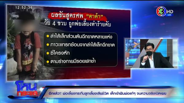 ผ่านความรักมาเยอะ สิ่งที่คุณกำลังพูดว่าเขาบอกคุณให้พูดแบบนี้แล้วคุณก็พูด คุณบอกว่าคุณกำลังเสียใจแล้วพูดไปแบบนั้น แต่จริงๆ ไม่ใช่หรอก คุณรักเขา หรือคุณหลงเขา กลัวเขาไปจากคุณ ในใจคุณรู้ว่าเกิดอะไร ก็เป็นอีกหนึ่งบทเรียนที่ต้องถอดบทเรียน รักใครไม่ผิด แต่ถ้ามีลูก มีครอบครัว แล้วมีคนเข้ามาในชีวิต ดูแลลูกให้ดีๆ อย่ารักผัวใหม่มากกว่าลูกของคุณ และสังเกตพฤติกรรม ถ้าเมื่อไหร่มีสิ่งที่ลูกคุณสะกิดใจ บอก พูด หรือมีร่องรอย มีเหตุเขาอารมณ์เสียกับลูก ให้ระวังจะมีเรื่องแบบนี้เกิดขึ้น สิ่งที่ฟังแล้วสะดุดใจ ชีวิตของผู้กระทำ เขาเคยพูดกับแฟนว่าเขาเองเคยถูกกระทำแบบนี้มาก่อนในชีวิตถูกพ่อจับเอาหน้าแหย่กรงหมาบ้าง ล้มลงไปพ่อเอาเท้ากระทืบบ้าง เหยียบหน้าบ้าง ถูกเฆี่ยน ถูกทำสารพัดสารเพ เขาบอกว่าแค่นี้มันน้อยไป เขาตีลูกแล้วบอกว่าแค่นี้ไม่เห็นเป็นอะไร โฟนอิน “รศ.นพ.สุริยเดว ทรีปาตี” กุมารแพทย์ผู้เชี่ยวชาญด้านเด็กและวัยรุ่น และผอ.ศูนย์คุณธรรม (องค์กรมหาชน) ตัวคนเป็นพ่อเลี้ยงบอกว่าถูกกระทำแบบนี้มาก่อนในวัยเด็ก เป็นไปได้มั้ยเป็นพฤติกรรมเลียนแบบสิ่งที่เขาถูกกระทำมา?