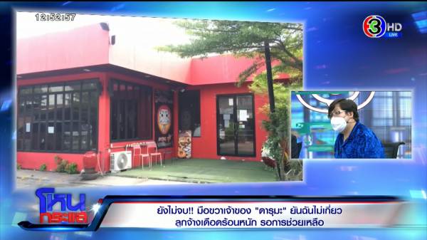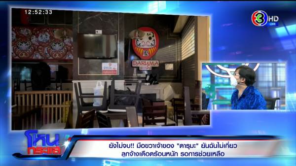 รายการโหนกระแสวันที่ 21 มิ.ย. 65 ดำเนินรายการโดย “หนุ่ม กรรชัย กำเนิดพลอย” ผลิตในนามบริษัท ดีคืนดีวัน จำกัด ออกอากาศทุกวันจันทร์-ศุกร์ เวลา 12.35 น. ทางช่อง 3 กดเลข 33 ตามต่อเรื่อง “ดารุมะ ซูชิ” บุฟเฟต์ ที่กำลังเป็นประเด็นดราม่า วันนี้สัมภาษณ์ มือขวาของ “บอลนี่ เมธา ชลิงสุข” เจ้าของร้านดารุมะ ซูชิ อย่าง คุณฝน, คุณดา, คุณแพน, คุณส้ม รวมถึง “คุณเปา” แอดมินกลุ่มผู้เสียหาย ที่ออกมาเผยว่าบอลมีมือขวาเป็นผู้หญิงและยังอยู่เมืองไทย มาพร้อม “คุณบุญชอบ สุทธมนัสวงษ์” ปลัดกระทรวงแรงงาน