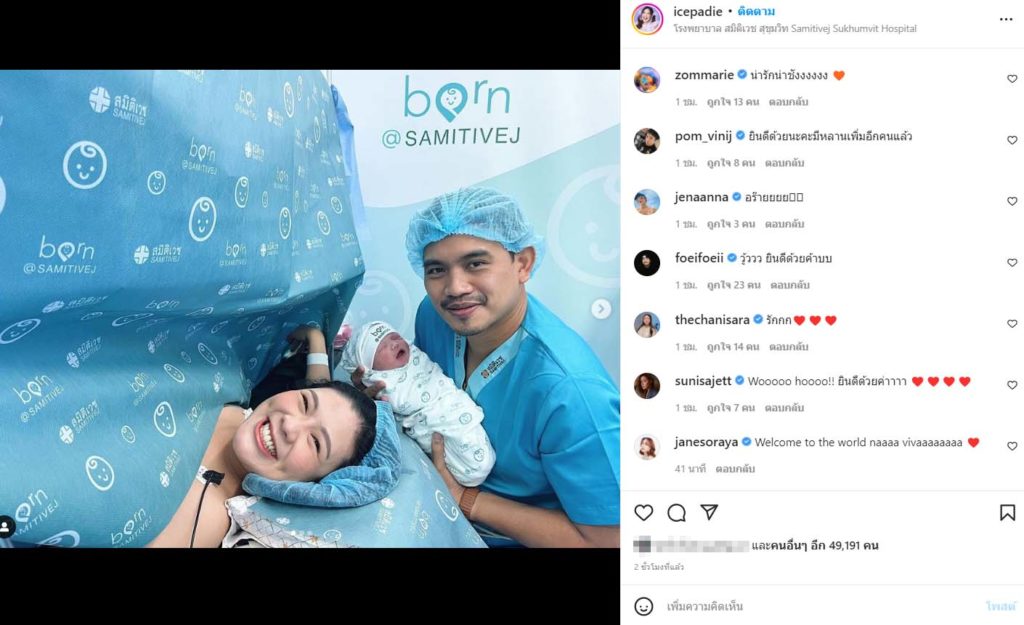 โดย “ไอซ์พาดี้” โพสต์รูปพร้อมแคปชั่นว่า “วีว่าาา มาละค่าา เจ้าหญิงน้อยของมามี๊ แดดดี๊กะมามี๊เม้าาากันอยู่ หนูก็ออกมาเลยยยย ร้องไห้เสียงดังฟังชัด แอบมีแผดเสียงเบาๆ จนแดดดี๊บอกว่าน่าจะขี้โวยวายเหมือนมามี๊ มามี๊แอบจุ๊บแก้มหนู มันนิ่มมาก ๆ ๆ ๆ ๆ เยยยยยย และมามี๊คุยกะหนูหนูก็เลิกร้องไห้เลยด้วยยย แต่ตอนนี้หนูต้องอยู่ในยานอวกาศไปก่อน เพราะมีน้ำในปอดนิสนุง & น้ำตาลตกหน่อย ๆ