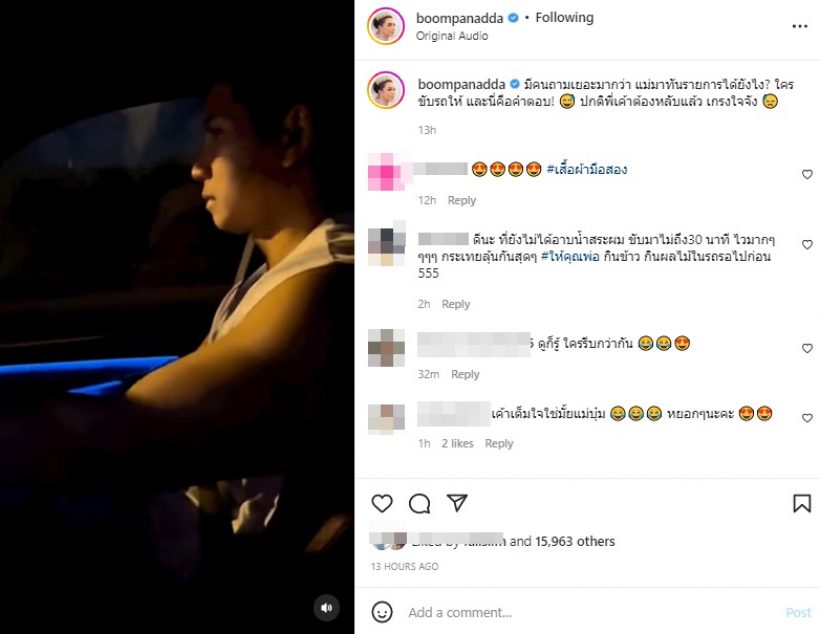 ล่าสุด แม่บุ๋ม ได้โพสต์คลิปผ่านอินสตราแกรม @boompanadda เป็นคลิปที่หนุ่มก็อตขับรถพาไปทำงาน พร้อมแคปชั่นบอกว่า “มีคนถามเยอะมากว่า แม่มาทันรายการได้ยังไง? ใครขับรถให้ และนี่คือคำตอบ! ปกติพี่เค้าต้องหลับแล้ว เกรงใจจัง”