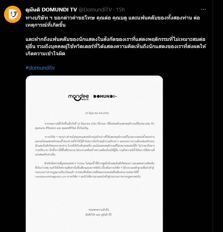 ล่าสุด ต้นสังกัด ดูมันดิ DOMUNDI TV ของ ซี พฤกษ์ และ นุนิว ชวรินทร์ ได้ออกมาแถลงขอโทษอย่างเป็นทางการ