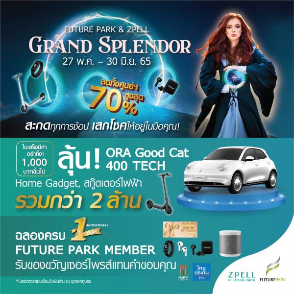 ดีลสุดคุ้มกลางปี ที่เหล่านักช้อปห้ามพลาด นอกจากจะได้สินค้าในราคาพิเศษแล้ว ทุกการซื้อและใบเสร็จของลูกค้ามีค่าอย่าทิ้ง สามารถนำมาลุ้นรับโชคสุดฟิน ในแคมเปญ “Future Park & Zpell Grand Splendor” พร้อมร่วมเฉลิมฉลองกับการครบรอบ 1 ปี FUTURE PARK MEMBER ลุ้นรับของรางวัลอีกมากมาย ช้อปเลยได้ตั้งแต่วันนี้ – 30 มิถุนายน 2565 ณ ศูนย์การค้าฟิวเจอร์พาร์ค และสเปลล์ หากต้องการสอบถามข้อมูลเพิ่มเติมสามารถติดต่อได้ที่ ฝ่ายประชาสัมพันธ์ ศูนย์การค้าฟิวเจอร์พาร์ค โทรศัพท์ 02-958-0011 ต่อ 1036, 1233 และ https://www.futurepark.co.th