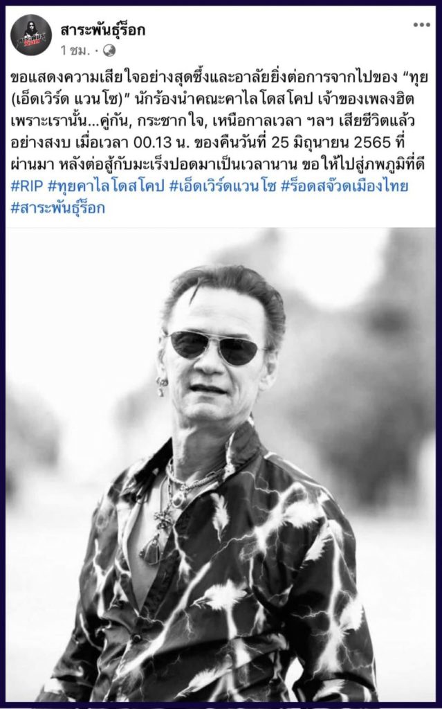 โดยเฟซบุ๊ก สาระพันธุ์ร็อก ได้โพสต์แจ้งข่าวระบุว่า “ขอแสดงความเสียใจอย่างสุดซึ้งและอาลัยยิ่งต่อการจากไปของ “ทุย (เอ็ดเวิร์ด แวนโซ)” นักร้องนำคณะคาไลโดสโคป เจ้าของเพลงฮิต เพราะเรานั้น , คู่กัน, กระชากใจ, เหนือกาลเวลา ฯลฯ เสียชีวิตแล้วอย่างสงบ เมื่อเวลา 00.13 น. ของคืนวันที่ 25 มิถุนายน 2565 ที่ผ่านมา หลังต่อสู้กับมะเร็งปอดมาเป็นเวลานาน ขอให้ไปสู่ภพภูมิที่ดี #RIP #ทุยคาไลโดสโคป #เอ็ดเวิร์ดแวนโซ #ร็อดสจ๊วดเมืองไทย #สาระพันธุ์ร็อก”