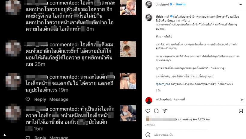 ล่าสุด ดันเจอชาวเน็ตรายหนึ่งตามแซะและด่าหยาบแรงถึงลูกชายฝาแฝดจนทางด้านคุณพ่อไม่ทน โพสต์ภาพข้อความที่ลูกชายโดนด่าหยาบลงอินสตราแกรม @thisismvl พร้อมซัดกลับว่า “ผมไม่ค่อยจะเข้าใจตรรกะของคุณเท่าไหร่นะครับ แต่เรื่องนี้เป็นเรื่องใหญ่มากสำหรับผม คุณจะพูดอะไรเสีย ๆ หายๆกับผมยังไงก็ได้ ผมรับได้ แต่นี่คุณทำกับลูกๆของผม