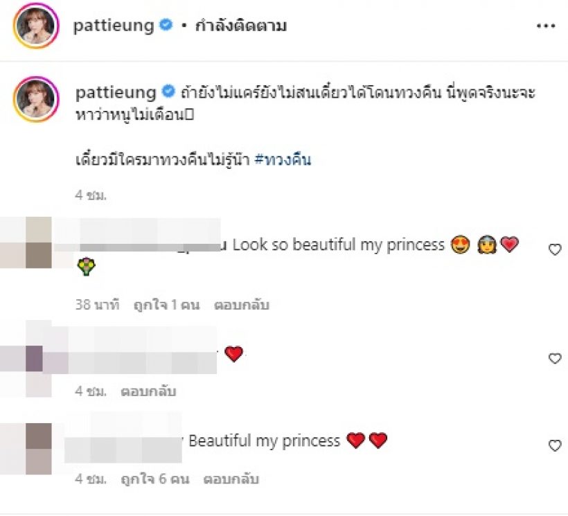ล่าสุด แพทตี้ โพสต์ภาพตัวเองผ่านอินสตราแกรม @pattieung เป็นภาพที่มาในชุดสไตล์น่ารักแฝงความเซ็กซี่ เสื้อกล้ามครึ่งตัวและกางเกงยีนส์ขายาว โชว์เอวเอสหน้าท้องแบนราบ นอกจากความแซ่บเรื่องชุด แพทตี้ก็โชว์สีผมใหม่ที่ทำสีผมสีม่วงช่วงปลายผมจ้า