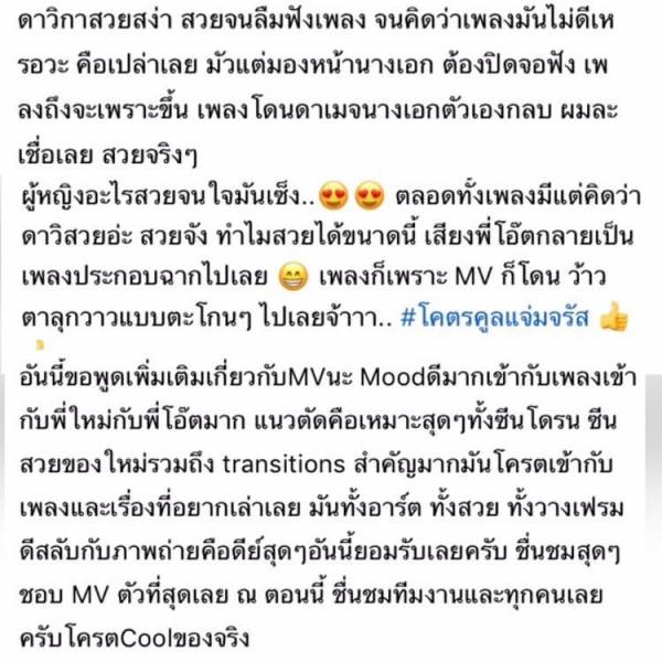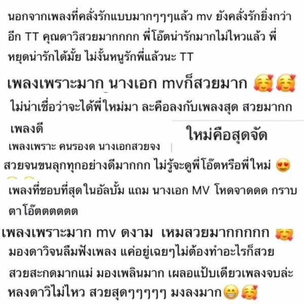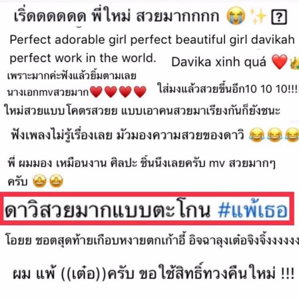 เราตามไปส่องคอมเมนท์ในมิวสิควีดีโอเพลงนี้บน Youtube พบว่ามีแต่คนเข้ามาชมความสวยของ ใหม่ ดาวิกา เช่นคอมเมนท์ว่า ใหม่ดาวิกา สวยที่สุด, อยากจะตะโกนใส่แบบ อะไรจะสวยขนาดนี้อ่ะ ต้องสวยขนาดนี้ไหม พระเจ้าลำเอียงมาก555555, จริงด้วยสวยแบบตะโกนนน, ดาวิสวยจนจะวูบ สวยจนขนลุกเลย เพลงนี้คือดาวิจริง ๆ ดาวิกาเท่านั้น OMG😍, ถ้าไม่ใช่ดาวิกาไมรู้จะเป็นใครที่เราจัองนางได้ทั้งเอ็มวี เอาแบบแค่หน้าอย่างเดียวไม่ต้องเคลื่อนไหวยังไม่เบื่อ คืออะไรจะสวยขนาดนี้ ทำไมต้องสวยขนาดนี้อะ ดูเพลินมาก, ดู 2 รอบติด รอบแรกเมาความสวยนางเอกMV น้องใหม่ดาวิกา คนอะไรสวยทุกท่วงท่าจริง ๆ หน้าสวยทุกมุม สวยทุกยิ้ม สารภาพสวยจนลืมฟังเพลง ต้องวนอีกรอบเพื่อฟังเพลง จังหวะติดหูมาก เสียงโอ๊ตมีเอกลักษณ์จริง ๆ ฯลฯ