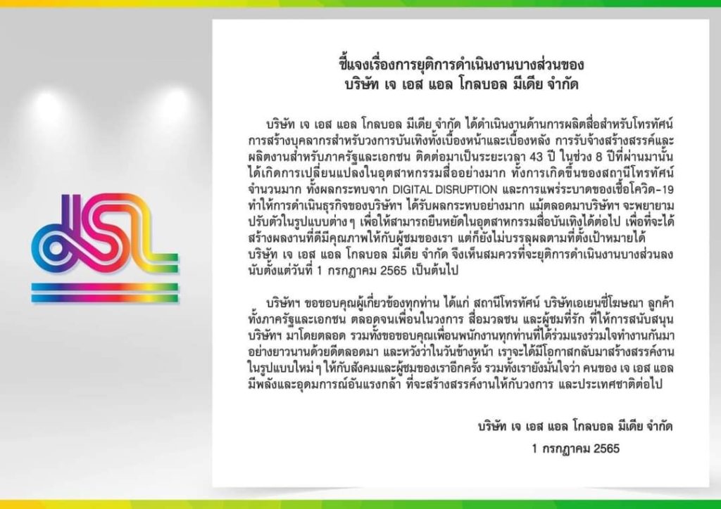 บริษัท เจ เอส แอล โกลบอล มีเดีย จำกัดได้ดำเนินงานด้านการผลิตสื่อสำหรับโทรทัศน์ การสร้างบุคลากรสำหรับวงการบันเทิงทั้งเบื้องหน้าและเบื้องหลัง การรับจ้างสร้างสรรค์และผลิตงานสำหรับภาครัฐและเอกชน ติดต่อมาเป็นระยะเวลา 43 ปี ในช่วง 8 ปีที่ผ่านมานั้น ได้เกิดการเปลี่ยนแปลงในอุตสาหกรรมสื่ออย่างมาก ทั้งการเกิดขึ้นของสถานีโทรทัศน์จำนวนมาก ทั้งผลกระทบจาก DIGITAL DISRUPTION และการแพร่ระบาดของเชื้อโควิด-19 ทำให้การดำเนินธุรกิจของบริษัทฯ ได้รับผลกระทบอย่างมาก แม้ตลอดมาบริษัทฯ จะพยายามปรับตัวในรูปแบบต่าง ๆ เพื่อให้สามารถยืนหยัดในอุตสาหกรรมสื่อบันเทิงได้ต่อไป เพื่อที่จะได้สร้างผลงานที่ดีมีคุณภาพให้กับผู้ชมของเรา แต่ก็ยังไม่บรรลุผลตามที่ตั้งเป้าหมายได้บริษัท เจ เอส แอล โกลบอล มีเดีย จำกัด จึงเห็นสมควรที่จะยุติการดำเนินงานบางส่วนลง นับตั้งแต่วันที่ 1 กรกฎาคม 2565 เป็นต้นไป