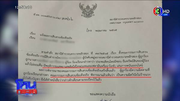 ครั้งที่หนึ่งและสอง ที่สน. หลักสอง ทั้งสองครั้งเขาปฏิเสธ หลักสองก็บอกว่ายุติ ในนี้บอกว่ามีการตรวจสอบตร.นายนี้แล้ว วิธีการตรวจยาเสพติดในปัสสาวะ ผลตรวจเป็นลบไม่พบยาเสพติดในร่างกาย ส่วนเรื่องการพนัน มีการตรวจสอบแล้วเป็นการเล่นเกมออนไลน์ ไม่ใช่การพนันแต่อย่างใด หลังจากนั้นไปบกน. แล้วเป็นยังไง?