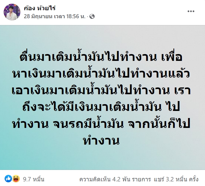 ซึ่ง ก้อง ได้โพสใน Facebook ด้วยข้อความว่า “ตื่นมาเติมน้ำมันไปทำงาน เพื่อหาเงินมาเติมน้ำมันไปทำงาน แล้วเอาเงินมาเติมน้ำมันไปทำงาน เราถึงจะได้มีเงินมาเติมน้ำมัน ไปทำงาน จนรถมีน้ำมันจากนั้นก็ไปทำงาน”