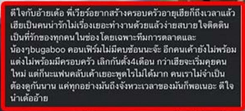 ดีใจกับอ้ายเด้อ พี่เวียร์อยากสร้างครอบครัว อายุเฮียก็ถึงเวลาแล้ว เฮียเป็นคนน่ารัก ไม่เรื่องเยอะ ทำงานด้วยแล้วง่าย สบายใจ ติดดิน เป็นที่รักของทุกคนในช่อง โดยเฉพาะทีมการตลาด และน้องๆ bugaboo คอนเฟิร์มไม่มีคบซ้อนนะจ๊ะ อีกคนเขายังไม่พร้อมแต่ง ไม่พร้อมมีครอบครัว เลิกกันตั้ง 4 เดือนกว่า เฮียจะเริ่มคุยคนใหม่ แต่ก็นะแฟนคลับเขาเยอะ พูดไรไม่ได้มาก คนเราไม่จำเป็นต้องดูกันนาน แค่ทุกอย่างมันถึงจังหวะเวลาของมันก็พอเนอะ ดีใจนำเด้ออ้าย