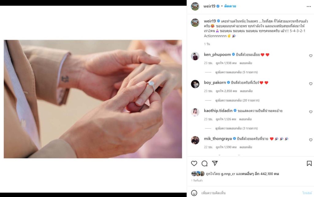 เคยทำแต่ในหนัง,ในละคร ในที่สุด ก็ได้สวมแหวนจริง ๆ แล้วครับ ขอบคุณทุกคำอวยพร ทุกกำลังใจ และแรงสนับสนุนที่ส่งมาให้เรา 2 คนขอบคุณ ขอบคุณ ขอบคุณ ทุก ๆ คนนะครับ เอ้า!!! 5-4-3-2-1 Actionnnnnnn