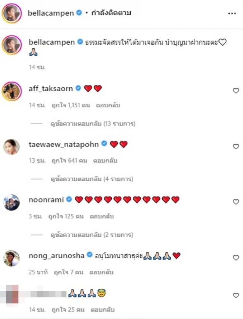 ล่าสุด เบลล่า โพสต์ภาพผ่านอินสตราแกรม @bellacampen หลังควงคุณแม่ไปทำบุญ นอกจากภาพสวย ๆ ที่เราได้เห็น แต่งานนี้ทุกคนสะดุดตาไปที่แคปชั่นว่า “ธรรมะจัดสรรให้ได้มาเจอกัน นำบุญมาฝากนะคะ”