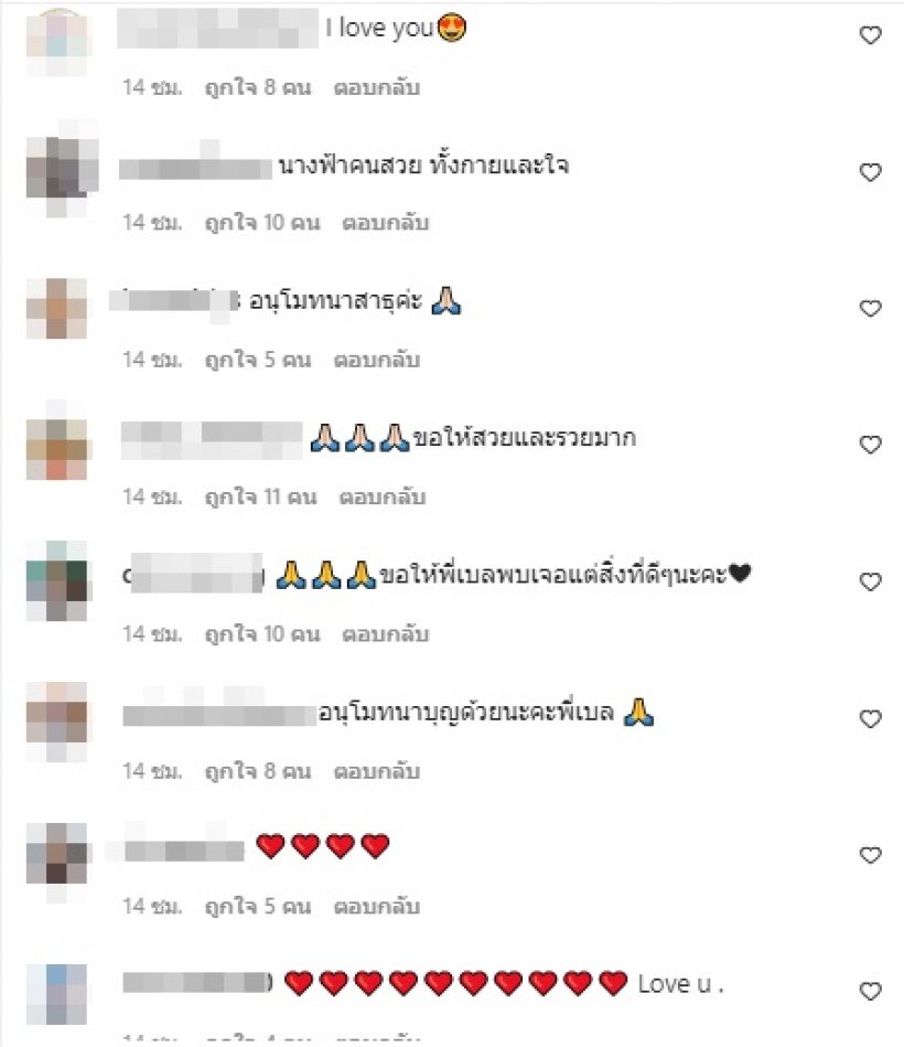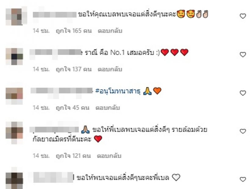 ท่ามกลางเพื่อนพี่น้องในวงการบันเทิงคอมเมนต์อิโมจิหัวใจรัว ๆ และแฟนคลับคอมเมนต์ส่งกำลังใจ ‘ขอให้คุณเบลพบเจอแต่สิ่งดีๆนะคะ , ราณี คือ No.1 เสมอครับ 🙂 , ขอให้พี่เบลเจอเนื้อคู่ไวๆค่ะ , พี่เบลกับวัดเหมือนเปลี่ยนวัดเป็นวิมานบนสวรรค์เลย นางฟ้าชัดๆ , ขออนุโมทนาบุญด้วยนะคะ สาธุค่ะ /รักนะคะ เป็นต้น’