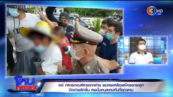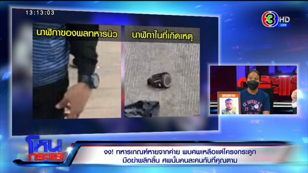 จุฑารัตน์ : กองพันปืนใหญ่ ลพบุรีค่ะ ก็ถามว่ามีเรื่องกับใครหรือเปล่าถึงได้หนี เพราะอะไร เพื่อนลูกชายบอกว่าไม่รู้จริงๆ เขาก็เอาเบอร์แม่เอาไปให้หมู่ หมู่ก็โทรมาเล่าเรื่องให้ฟังว่าเหตุเกิดวันที่ 10 มี.ค. จับได้ว่าลูกชายเสพยา เขาเลยลงโทษทางวินัย เอาลูกไปลอกคลองเบาๆ เราก็ไม่มีปัญหาอะไรตรงนั้น ลูกผิดก็ยอมรับ ก็ถามเขาว่าได้หากันทั่วหรือยัง ทำไมถึงเพิ่งแจ้ง หมู่บอกว่าหาอยู่ตลอด แต่หาไม่เจอ สักพักจ่าโทรมาอีกว่าคุณแม่มีใบไปที่บ้านไม่ต้องตกใจว่านิวได้หลบหนี แต่ถ้านิวไปที่บ้านจริง 10 วันให้ลาพัก แล้ว 10 วันให้เอามาส่งที่ค่าย จ่าโทรมาวันที่ 11 เลยค่ะ เราตกใจว่าลูกหนี โทรหาลูกด้วย และแชตหาเพื่อนลูกด้วย