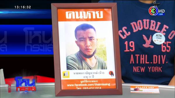 จุฑารัตน์ : ลูกชายหายไปเมื่อวันที่ 11 มี.ค.ค่ะ แล้วมีเพื่อนเขาคนนึงทักมาตอน 11 โมงครึ่งว่าใช่แม่นิวมั้ย ผมติดต่อนิวไม่ได้เลย ก็เลยตอบไปว่าใช่แม่นิว มีอะไรเหรอ เขาถามว่าติดต่อนิวได้มั้ย ก็บอกว่านิวเป็นทหาร คิดว่าเพื่อนแถวบ้านทักมา จนเขาบอกว่าเขาอยู่ค่ายเดียวกันกับลูกชาย เขาหายตัวไป นิวหนีกลับบ้านหรือเปล่า เราก็บอกว่าที่บ้านไม่มีนะลูก ลองหาที่ค่ายดู แอบหลับที่ไหนหรือเปล่า เขาก็บอกว่าหาจนทั่วแล้วไม่มี ก็ถามว่าลูกชายมีปากเสียงทะเลาะกับใครหรือเปล่า
