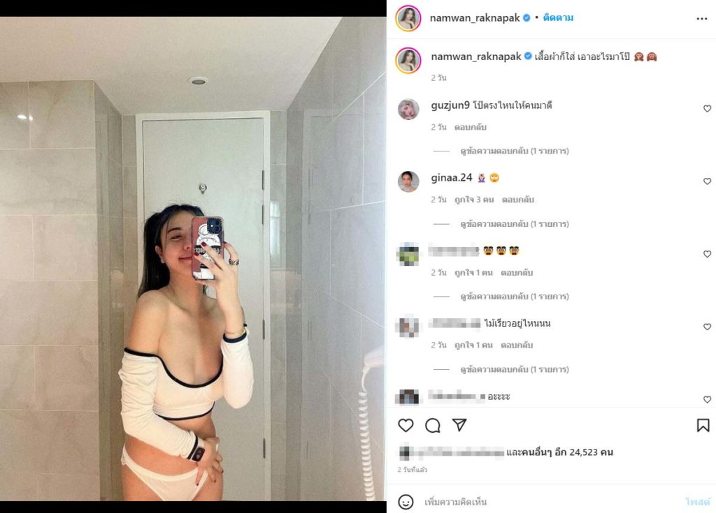 ล่าสุด น้ำหวาน ได้ลงรูปเซ็ทสุดแซ่บสวมชุดว่ายน้ำแบบทูพีซดีไซน์แขนยาวและเอวลอย เอวบางเฉียบ พร้อมแคปชั่นแซวตัวเองเบา ๆ ว่า “เสื้อผ้าก็ใส่ เอาอะไรมาโป๊”