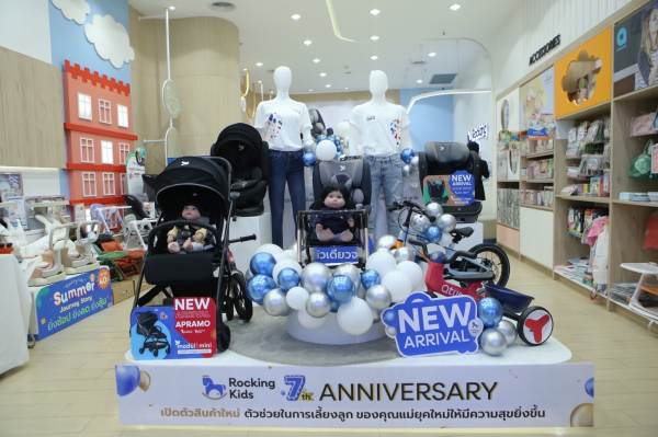 ในการฉลองครบรอบ 7 ปี แบรนด์ร็อคกิงคิดส์ผุดโปรดักส์จัดเต็มกว่า 7 รายการ จาก 3 กลุ่มผลิตภัณฑ์คัดสรรคุณภาพ อาทิ (1) คาร์ซีท Apramo 24:7 สำหรับเด็กแรกเกิด-4 ขวบ จากประเทศอังกฤษ (2) คาร์ซีทเด็กโต รุ่น Modul MAX (3) รถเข็นเด็ก Apromo Modul Mini ระบบอัตโนมัติ เปิดพับง่าย น้ำหนักเบา (4)จักรยาน Balance Bike ของแบรนด์ QTUS Sport Series จากประเทศเยอรมันนี (5) เก้าอี้ทานข้าวแบบพกพา Limited edition แบรนด์ APRAMO FLIPPA (Rock Star Black & Gold) (6) Essian Bumper Cushion หมอนกันตกเตียงของลูกน้อย และ (7) Essian Rabiit Cool Mat Set ผ้ารองที่นอนกันน้ำเยื่อไผ่ เป็นต้น