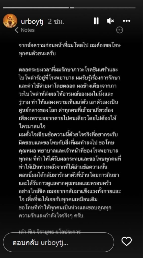 ซึ่งล่าสุด UrboyTJ เปิดเผยว่า “จากข้อความก่อนหน้าที่ผมโพสต์ไป ผมต้องขอโทษทุกคนด้วยนะครับ ตลอดระยะเวลาที่ผมรักษาภาวะโรคซึมเศร้าและไบโพลาร์อยู่ที่โรงพยาบาล ผมรับรู้เรื่องการรักษาและค่าใช้จ่ายมาโดยตลอด ผลข้างเคียงจากภาวะไบโพลาร์ส่งผลให้อารมณ์ของผมไม่นิ่งและวู่วาม ทำให้แสดงความเห็นแก่ตัว เอาตัวเองเป็นศูนย์กลางของโลก ด่าทุกคนที่เข้ามาเกี่ยวข้อง เพียงเพราะอยากตายไปคนเดียวโดยไม่ต้องให้ใครมาสนใจ ผมตั้งใจเขียนข้อความนี้ด้วยใจจริงที่อยากจะรับผิดชอบและขอโทษกับสิ่งที่ผมทำลงไป ขอโทษ คุณหมอ พยาบาล และเจ้าหน้าที่ของโรงพยาบาลทุกคน ที่ทำให้ได้รับผลกระทบและขอโทษทุกคนที่ทำให้เป็นห่วงหลังจากที่ได้อ่านข้อความนั้น ตอนนี้ผมได้กลับมารักษาตัวที่บ้านโดยการกินยา และได้รับการดูแลจากคุณหมอและครอบครัวอย่างใกล้ชิด ผมอยากกลับมาแข็งแรงทั้งกายและใจ เพื่อที่จะได้เจอกับทุกคนเหมือนเดิม ขอโทษที่ทำให้ทุกคนเป็นห่วงและขอบคุณทุกความรักและกำลังใจจริง ๆ ครับ”