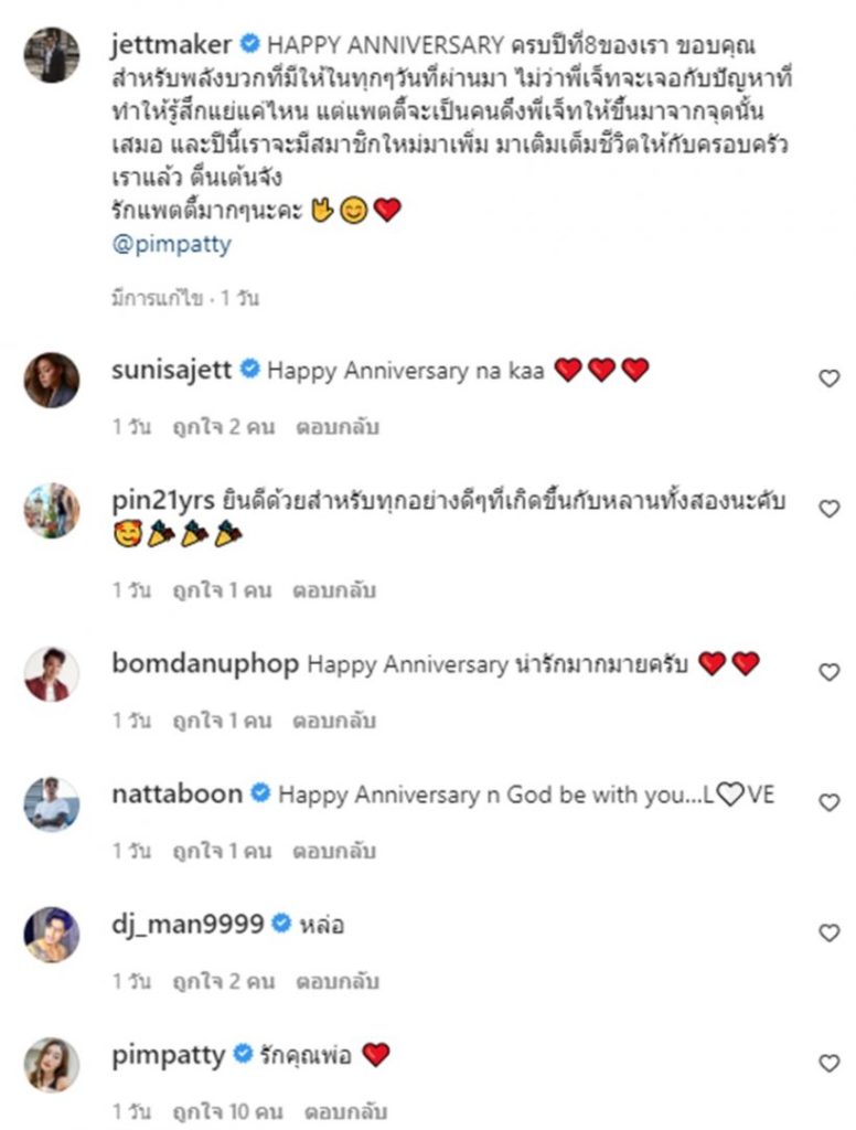 HAPPY ANNIVERSARY ครบปีที่ 8 ของเรา ขอบคุณสำหรับพลังบวกที่มีให้ในทุกๆวันที่ผ่านมา ไม่ว่าพี่เจ็ทจะเจอกับปัญหาที่ทำให้รู้สึกแย่แค่ไหน แต่แพตตี้จะเป็นคนดึงพี่เจ็ทให้ขึ้นมาจากจุดนั้นเสมอ และปีนี้เราจะมีสมาชิกใหม่มาเพิ่ม มาเติมเต็มชีวิตให้กับครอบครัวเราแล้ว ตื่นเต้นจัง รักแพตตี้มาก ๆ นะคะ
