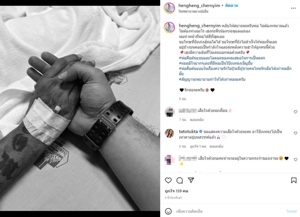 โดย เฮงเฮง ลูกชายโป๊งเหน่ง เผยว่าพ่อจากไป เมื่อเวลา 22.16 น. ที่ผ่านมา ของวันที่ 10 กรกฏาคม จริง ๆ เราพยายามบอกแม่ให้ไปเยี่ยมคุณพ่อ ซึ่งแม่ก็ทำใจนานมาก่อนจะมาพอแม่มาเยี่ยมพ่อแล้วลืมตาเหมือนพูดคุยกัน พอแม่กลับไปน้องก็บอกว่าพ่อชีพจรอ่อน อาการแย่ หัวใจเต้นช้าลง หมอก็บอกว่าให้ญาติทำใจเพราะพ่อพร้อมจะไปทุกเมื่อ เรียกญาติมาให้หมดผมก็ตีรถกลับไปบอกตรง ๆ ว่าตอนนี้คุณแม่ยังไม่รู้ว่าพ่อเสีย ผมก็ไล่โทร. บอกพี่น้องในวงการและคนที่สอบถามมา พ่อรักแม่มาก ทำให้รู้ว่าท่านรอแม่ คนที่รักที่สุดคือแม่ พอเขามาหาพ่อก็ไป เรื่องสาเหตุการเสียชีวิต ยังไม่ได้สอบถามหมอเลย ไม่ได้สรุปอะไรเลยเพราะวุ่น ๆ อยู่ ตอนนี้ก็เคลียร์เรื่องการฉีดฟอร์มาลีนและติดต่อวัด เรื่องวัดถ้าไม่มีอะไรผิดพลาดคือวัดช้างใหญ่ จ.พระนครศรีอยุธยา เพราะหลังจากหมอบอกให้ทำใจเราก็เตรียมเรื่องวัดไว้