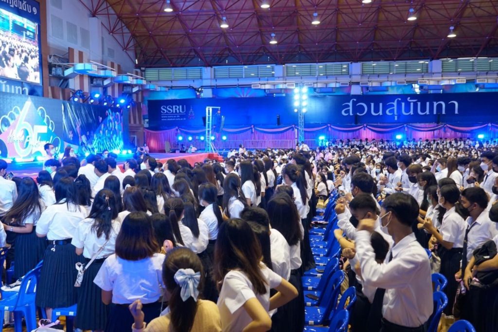วันที่ 11 กรกฎาคม 2565 เวลา 12.00 น. มหาวิทยาลัยราชภัฏสวนสุนันทา โดยกองพัฒนานักศึกษา จัดปฐมนิเทศนักศึกษาใหม่ ต้อนรับเปิดภาคเรียนที่ 1 ปีการศึกษา 2565 ณ อาคารศูนย์สุขภาพและกีฬาสวนสุนันทา และถ่ายทอดสดผ่านเพจ facebook มีนักศึกษาใหม่จากทุกคณะและวิทยาลัยเข้าร่วมกิจกรรมและชมการถ่ายทอดสดจำนวนกว่า 2 พันคน ทั้งนี้ รศ.ดร.ชุติกาญจน์ ศรีวิบูลย์ อธิการบดีพร้อมด้วยผู้บริหารให้การต้อนรับด้วยชุดสีสันสดใสต้อนรับน้องใหม่อย่างเป็นกันเองและอบอุ่น