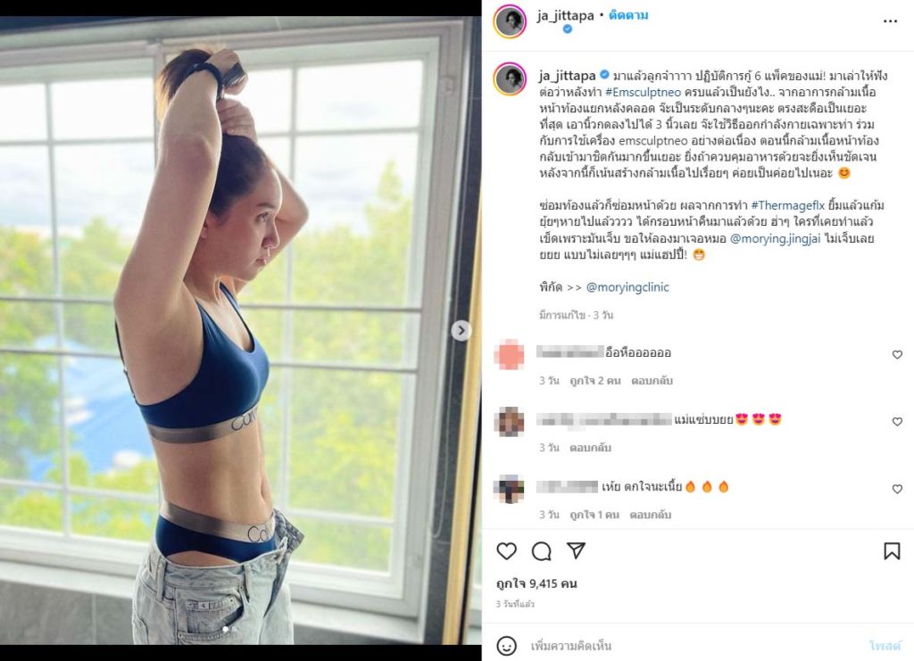 …ปฏิบัติการกู้ 6 แพ็คของแม่! มาเล่าให้ฟังต่อว่าหลังทำ #Emsculptneo ครบแล้วเป็นยังไง.. จากอาการกล้ามเนื้อหน้าท้องแยกหลังคลอด จ๊ะเป็นระดับกลางๆ นะคะ ตรงสะดือเป็นเยอะที่สุด เอานิ้วกดลงไปได้ 3 นิ้วเลย จ๊ะใช้วิธีออกกำลังกายเฉพาะท่า ร่วมกับการใช้เครื่อง emsculptneo อย่างต่อเนื่อง ตอนนี้กล้ามเนื้อหน้าท้องกลับเข้ามาชิดกันมากขึ้นเยอะ ยิ่งถ้าควบคุมอาหารด้วยจะยิ่งเห็นชัดเจน หลังจากนี้ก็เน้นสร้างกล้ามเนื้อไปเรื่อย ๆ ค่อยเป็นค่อยไปเนอะ ซ่อมท้องแล้วก็ซ่อมหน้าด้วย ผลจากการทำ #Thermageflx ยิ้มแล้วแก้มยุ้ย ๆ หายไปแล้วววว ได้กรอบหน้าคืนมาแล้วด้วย ฮ่า ๆ ใครที่เคยทำแล้วเข็ดเพราะมันเจ็บ ขอให้ลองมาเจอหมอ @morying.jingjai ไม่เจ็บเลยยยย แบบไม่เลย ๆ ๆ ๆ แม่แฮปปี้! 😁