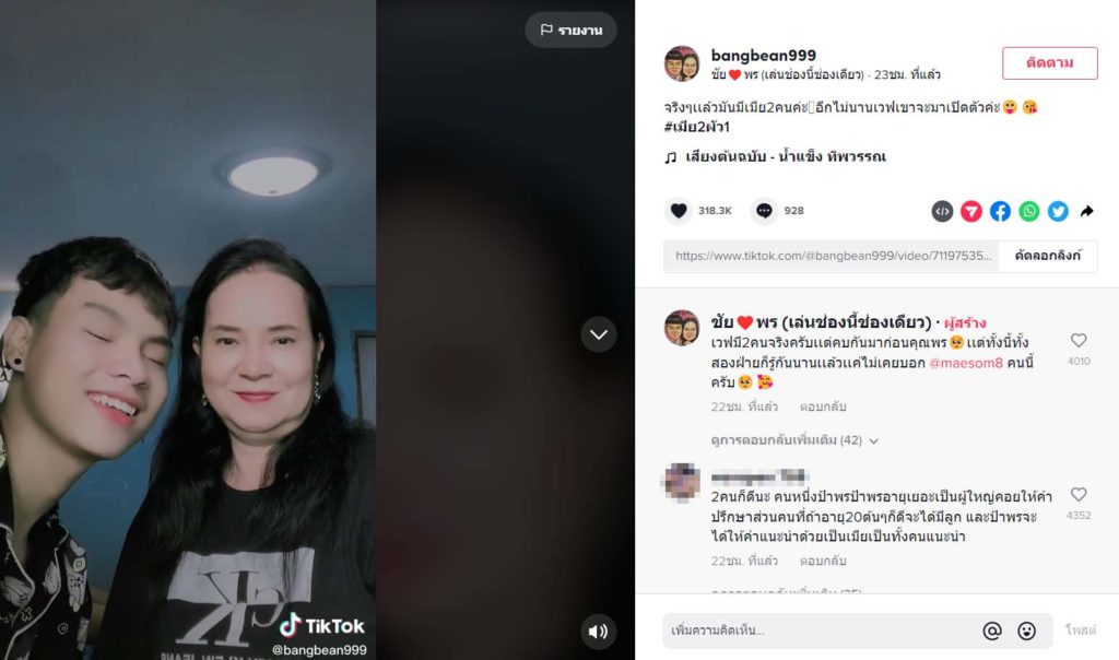 ล่าสุด คู่รักต่างวัย กลายเป็นประเด็นร้อนติดแฮชแท็กในทวิตเตอร์ #เมีย2ผัว1 โดย พี่พร อัปคลิปลง TikTok พร้อมแคปชั่น “จริง ๆ เเล้วมันมีเมีย2คนค่ะ อีกไม่นานเวฟเขาจะมาเปิดตัวค่ะ #เมีย2ผัว1”