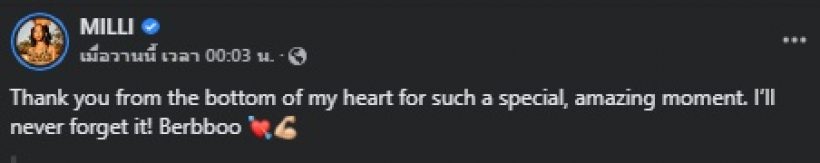 ล่าสุด มิลลิ ได้โพสต์รูปพร้อมแคปชั่น ผ่านเฟสบุ๊ก MILLI โดยแคปชั่นบอกว่า “เบิ้บบู p’jack #MindGames” และ “Thank you from the bottom of my heart for such a special, amazing moment. I’ll never forget it! #MAGICMAN Berbboo”