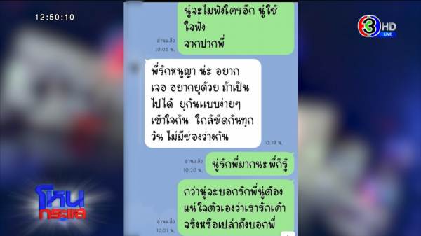 หนูถามว่ามีเมียจริงมั้ย บริสุทธิ์ใจเอาใบหย่ามาดูหน่อย ไหนบอกหย่าแล้ว ทำไมไม่ส่งใบหย่ามาให้ดู เขาบอกว่าพี่จะเล่าให้ฟังทีหลัง ตอนนี้คุยกับทนาย คุณก็บอกว่าเกลียด ไม่ไหวแล้ว ผู้ชายบอกว่าคิดว่าพี่เป็นแบบที่เขาว่าเหรอ พี่ไม่เลวขนาดนั้น เขาว่าคุณญาด้วย เขาว่าคุณญาแรง หนูถามว่านอนกับทุกคนมั้ย เขาบอกว่าคนชื่อตา ไม่ได้คุยกันนานแล้ว เขามีนิสัยคล้าย ๆ คนชื่อญา สองคนนี้เหมือนคนไม่ดี คุณส่งไลน์ไปหาเขาว่าแน่จริงให้โทรมาเลย?