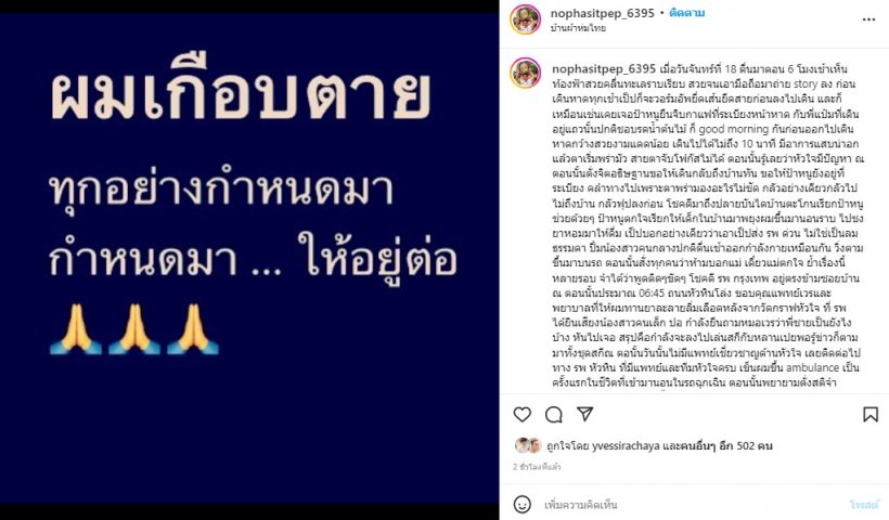ล่าสุด “เป็ป” เล่าวินาทีเกือบตาย ผ่านอินสตราแกรม @nophasitpep_6395 มีใจความว่า