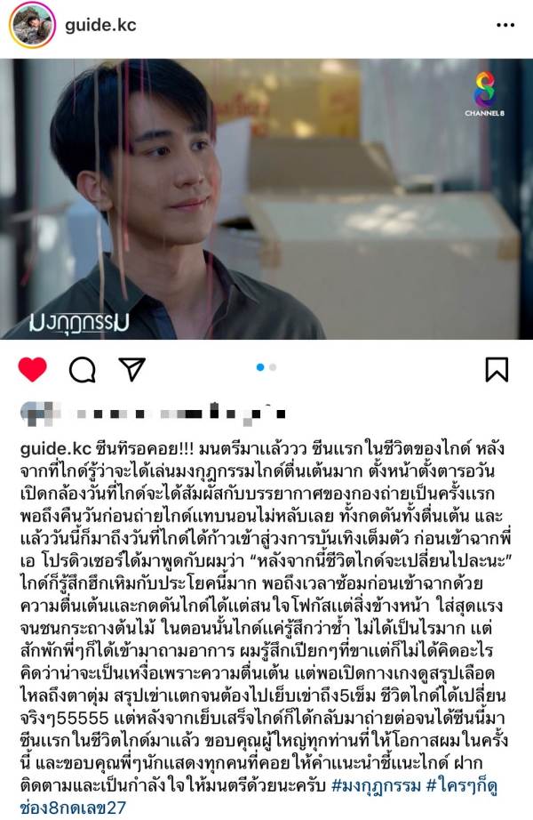 โดยหนุ่มไกด์ ได้ขึ้นแสดงความรู้สึกในอินสตราแกรม @guide.kc หลังซีนแรกในชีวิตของตัวเองได้ออกอากาศว่า