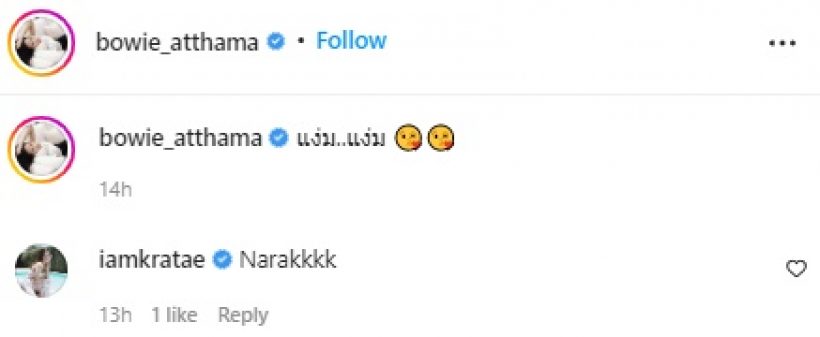 ล่าสุด สาวโบวี่ โพสต์ภาพคู่ผ่านอินสตราแกรม @bowie_atthama เป็นภาพคู่กับหวานใจ เป็นโมเมนต์ที่น่ารักและสวีทมากเวอร์ ทำเอาแฟนคลับเข้ามาคอมเมนต์สนั่นทั้งชมความน่ารัก