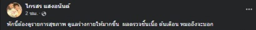 ล่าสุด ไกรสร โพสต์รูปพร้อมแคปชั่นว่า “พักนี้ต้องดูรายการสุขภาพ ดูแลร่างกายให้มากขึ้น ผลตรวจชิ้นเนื้อ ต้นเดือน หมอถึงจะบอก”