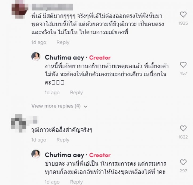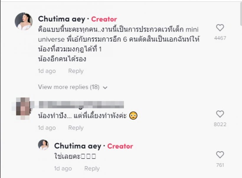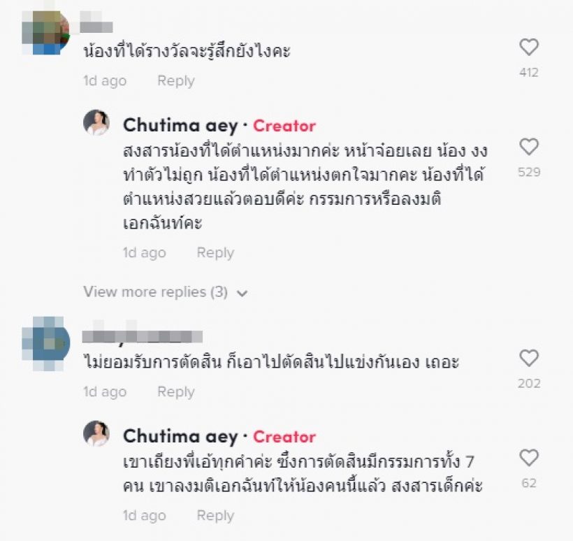 ซึ่งจากคลิปมีการชี้แจงว่า “ความคิดเห็นอาจจะไม่ตรงกัน แต่ยอมรับว่าน้อง ๆ สวยทุกคนเลยตัดสินใจกันยากมาก พี่ตัดสินจากคำตอบของเด็ก น้องทุกคนตอบดีหมดนะ ทุกคนที่จะมาประกวดที่นี้ต้องเตรียมความพร้อมมาเหมือนกันหมด แต่พี่ได้ถามคำถามเรียลกับน้องคนนี้ แล้วน้องกับตอบคำถามของพี่ได้ ถ้าคนที่หนูไม่ชอบขึ้นได้รับตำแหน่ง หนูจะตอบว่าอย่างไง โดยน้องคนนี้ตอบออกมาจากใจเขาว่า มันคือการเสียสละ ถ้าเพื่อนได้ก็ยินดี”