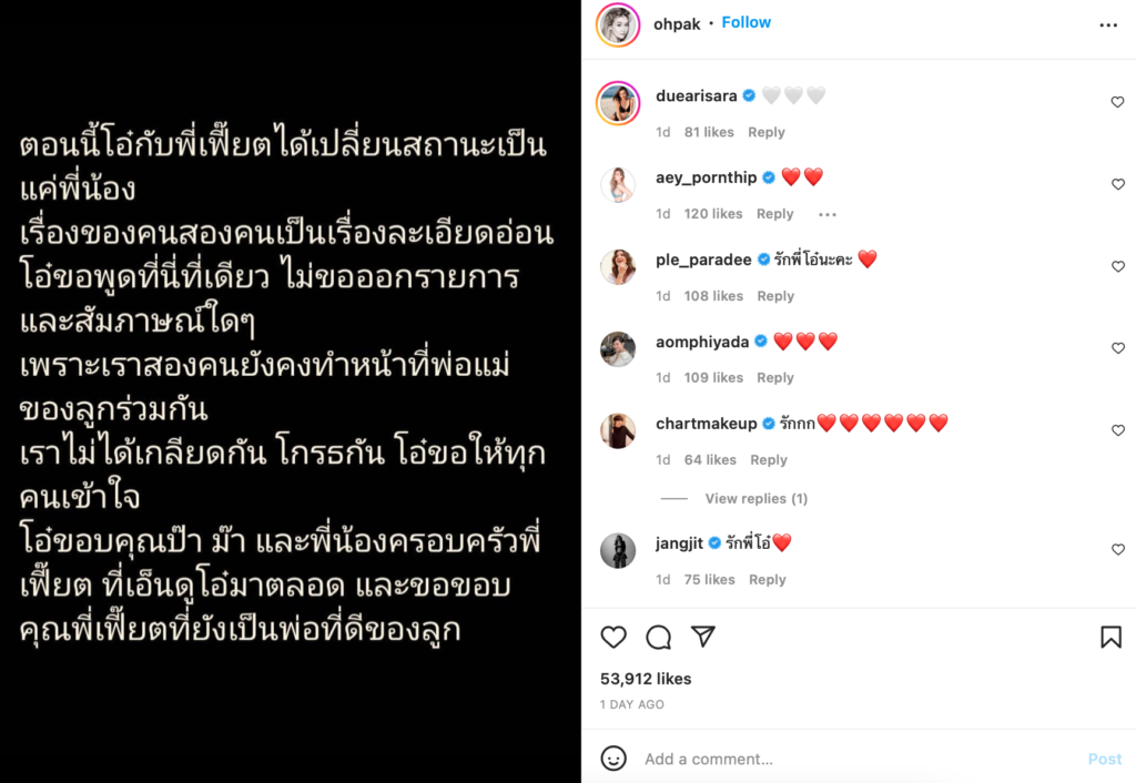 ล่าสุด โอ๋ ภัคจีรา ได้ออกมาเคลื่อนไหว หลังประกาศเลิกสามี “เฟี๊ยต มธุกร” โดยโพสต์ข้อความผ่านอินสตราแกรมส่วนตัว @ohpak ระบุว่า…