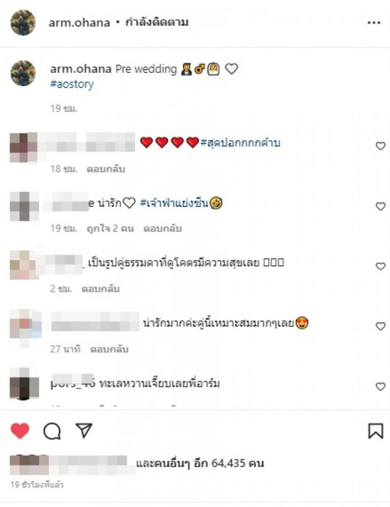 ล่าสุด หนุ่มอาร์ม ได้โพสต์ภาพคู่แฟนสาวผ่านอินสตราแกรม @arm.ohana พร้อมบอกว่า “Pre wedding #aostory”