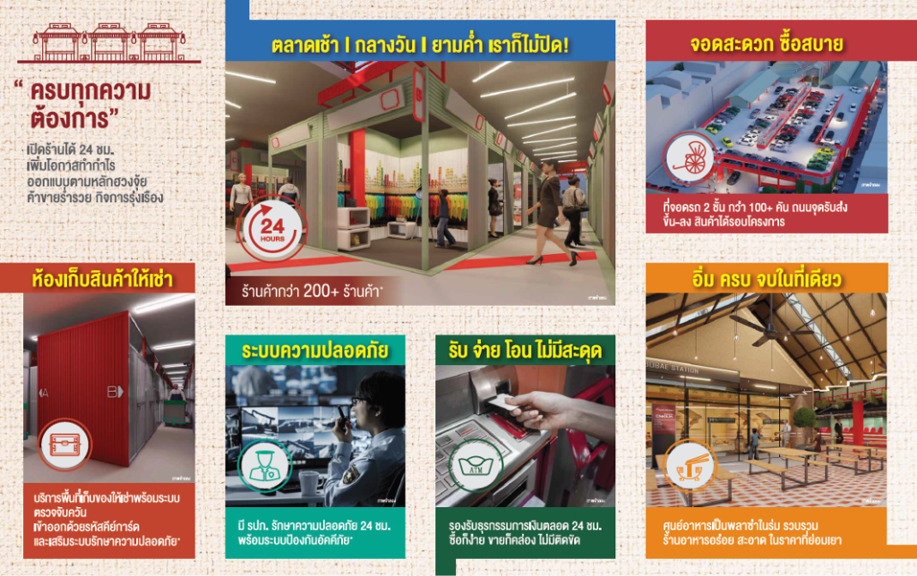 นอกจากนี้ ทางโครงการยังมีศูนย์อาหารบนชั้น 2 ที่รวมร้านอร่อยแถมราคาประหยัดไว้บริการลูกค้า รวมทั้งมีห้องสต๊อกเก็บสินค้าให้เช่าในกรณีที่ต้องการเก็บสินค้าเพิ่มเติมอีกด้วย “โบ๊เบ๊สเตชั่น” ยึดแนวคิดในการออกแบบโครงการเพื่อตอบโจทย์ทุกปัญหาที่ผู้ค้ารวมถึงลูกค้าโบ๊เบ๊ปัจจุบันประสบอยู่ ไม่ว่าจะเป็นเรื่องที่จอดรถ ห้องน้ำสะอาด ห้องเช่าสต๊อกสินค้า ศูนย์อาหาร แหล่งทำธุรกรรมการเงิน “เนื่องจากเราเปิด 24 ชม. ผู้ค้าสามารถเปิดขายได้ทั้งตลาดกลางวันและกลางคืน แถมไม่ต้องกลัวว่าอนาคตจะค้าขายบนทางเท้าไม่ได้ ถือว่าผู้ค้าที่เลือกอยู่กับโครงการเรา ลงทุนแบบความเสี่ยงต่ำ ผลตอบแทนสูง”