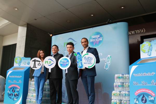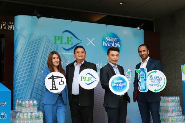 นายธาดา ชุมะศารทูล กรรมการบริหาร และ คุณนันทพัชร์ ศรีสุชาต รองประธานบริหาร ฝ่ายการตลาด บมจ.เพาเวอร์ไลน์ เอ็นจิเนียริ่ง (PLE) บริษัทประกอบธุรกิจรับเหมาก่อสร้างครบวงจร พร้อมกับ คุณปิยะทัศน์ โล่อธิกุล ผู้จัดการฝ่ายขายแผนกน้ำดื่ม และคุณศุภวัฒน์ คามีเยาน์ ผู้จัดการโปรเจกกลยุทธิ์ แผนกน้ำดื่ม บริษัท เนสท์เล่ (ไทย) จำกัด ผู้ผลิตและจัดจำหน่ายน้ำดื่มเนสท์เล่ เพียวไลฟ์ กับครั้งแรกในการผนึกกำลังข้ามอุตสาหกรรมเพื่อร่วมส่งเสริมความยั่งยืนในพื้นที่โครงการก่อสร้าง ผ่านการตั้งจุดแยกขยะสำหรับการเก็บขวดน้ำและขยะรีไซเคิลอื่น ๆ ภายในสำนักงานใหญ่ บมจ.เพาเวอร์ไลน์ เอ็นจิเนียริ่ง (PLE) และไซต์ก่อสร้างทั่วกรุงเทพมหานครและปริมณฑล ภายใต้แนวคิด “คืนชีวิตให้ขวดพลาสติก” ก่อนจะนำไปเข้ากระบวนการแปรรูปเพื่อรีไซเคิลพลาสติกต่อไป โดยโครงการได้คำนึงถึงคนงานก่อสร้างชาวกัมพูชาและเมียนมาร์จึงได้จัดทำป้ายสื่อสารโครงการ 3 ภาษา ภายในพื้นที่ก่อสร้างเพื่อส่งเสริมให้เกิดความตื่นตัวเรื่องการคัดแยกขยะในกลุ่มคนงาน นอกจากนี้ยังได้รายงานตัวเลขวัดผลโครงการผ่าน Sustainability Board บริเวณหน้าพื้นที่โครงการก่อสร้างควบคู่ไปกับ Safety Board เพื่อแสดงจำนวนขยะจากบรรจุภัณฑ์ที่คัดแยกได้ในโครงการ ตลอดจนคำนวณค่า Carbon Emission ที่สามารถลดได้จากการดำเนินโครงการ อันจะขับเคลื่อนไปสู่เป้าหมายใหญ่ของบมจ.เพาเวอร์ไลน์ เอ็นจิเนียริ่ง (PLE) และเนสท์เล่ในการสนับสนุนความยั่งยืนต่อไป