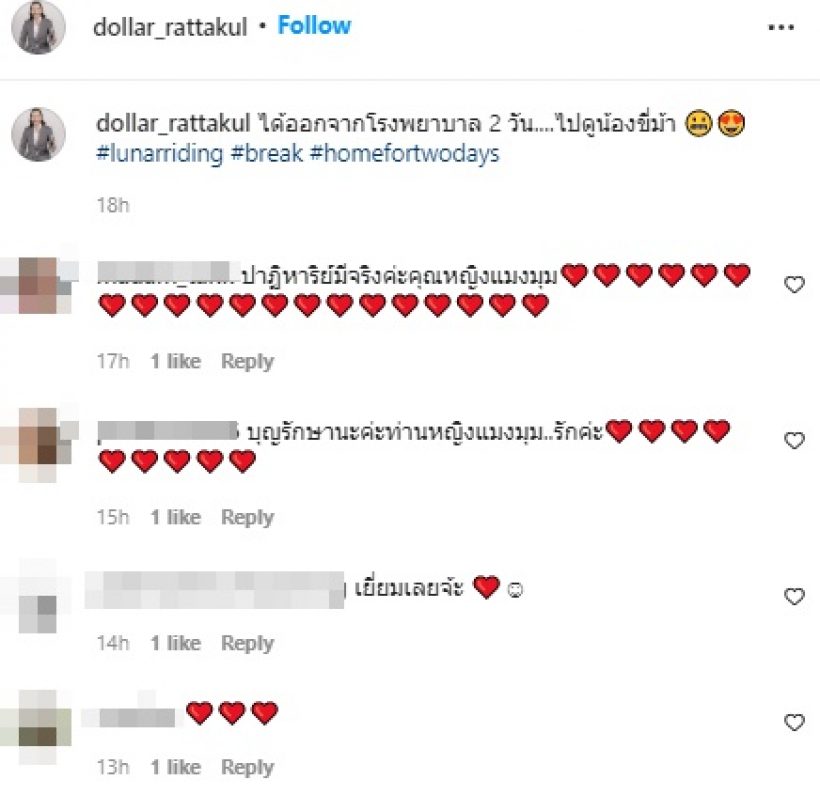 ล่าสุด นายพลดอลลาร์ ได้โพสต์ภาพพร้อมแคปชั่นว่า “ได้ออกจากโรงพยาบาล 2 วัน….ไปดูน้องขี่ม้า 😬😍 #lunarriding #break #homefortwodays“