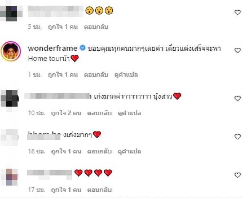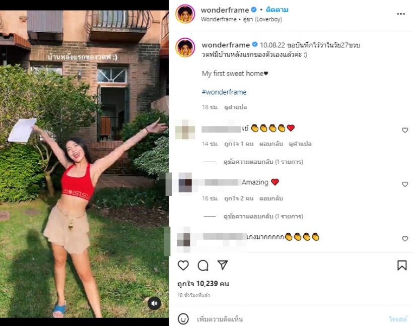ล่าสุด วันเดอร์เฟรม ทำสำเร็จแล้ว โดยเธอมีบ้านหลังแรกเป็นของตัวเองแล้ว และโพสต์รูปผ่านอินสตราแกรม พร้อมแคปชั่นว่า “10.08.22 ขอบันทึกไว้ว่าในวัย27ขวบ