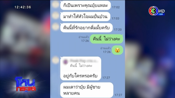ก่อนหน้านี้คุณเห็นไลน์ของเขาจะมีการส่งมาขู่ฆ่าเปิดข้อความแชท “เกาะผู้หญิงกิน คุณใส่ร้ายผมคุณเหยียบย่ำศักดิ์ศรีลูกผู้ชายเหยียดหยามผม” คุณไปด่าเขาว่าอะไร