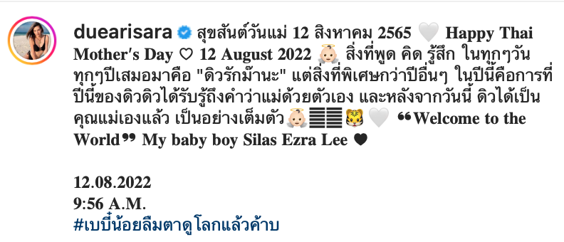 สุขสันต์วันแม่ 𝟏𝟐 สิงหาคม 𝟐𝟓𝟔𝟓 🤍 𝐇𝐚𝐩𝐩𝐲 𝐓𝐡𝐚𝐢 𝐌𝐨𝐭𝐡𝐞𝐫’𝐬 𝐃𝐚𝐲 ♡︎ 𝟏𝟐 𝐀𝐮𝐠𝐮𝐬𝐭 𝟐𝟎𝟐𝟐 👼🏻 สิ่งที่พูด คิด รู้สึก ในทุกๆวัน ทุกๆปีเสมอมาคือ “ดิวรักม๊านะ” แต่สิ่งที่พิเศษกว่าปีอื่นๆ ในปีนี้คือการที่ปีนี้ของดิวดิวได้รับรู้ถึงคำว่าแม่ด้วยตัวเอง และหลังจากวันนี้ ดิวได้เป็น คุณแม่เองแล้ว เป็นอย่างเต็มตัว👼🏻🫶🏻🐯🤍 ❝𝐖𝐞𝐥𝐜𝐨𝐦𝐞 𝐭𝐨 𝐭𝐡𝐞 𝐖𝐨𝐫𝐥𝐝❞ 𝐌𝐲 𝐛𝐚𝐛𝐲 𝐛𝐨𝐲 𝐒𝐢𝐥𝐚𝐬 𝐄𝐳𝐫𝐚 𝐋𝐞𝐞 ♥︎