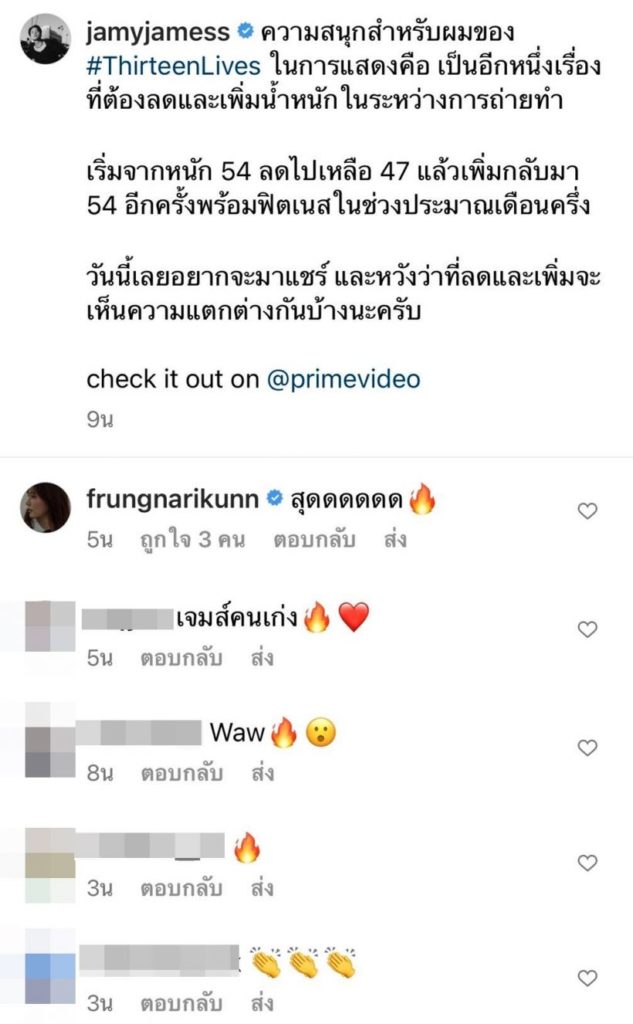 ล่าสุด เจมส์ เเชร์ประสบการณ์การลดน้ำหนักเเละเพิ่มน้ำหนัก ขณะที่ตัวเองนั้นได้ถ่ายทำภาพยนต์ Thirteen Lives โดยโพสต์นี้มีเเคปชั่นว่า ความสนุกสำหรับผมของ #ThirteenLives ในการแสดงคือ เป็นอีกหนึ่งเรื่องที่ต้องลดและเพิ่มน้ำหนักในระหว่างการถ่ายทำเริ่มจากหนัก 54 ลดไปเหลือ 47 แล้วเพิ่มกลับมา 54 อีกครั้งพร้อมฟิตเนสในช่วงประมาณเดือนครึ่ง