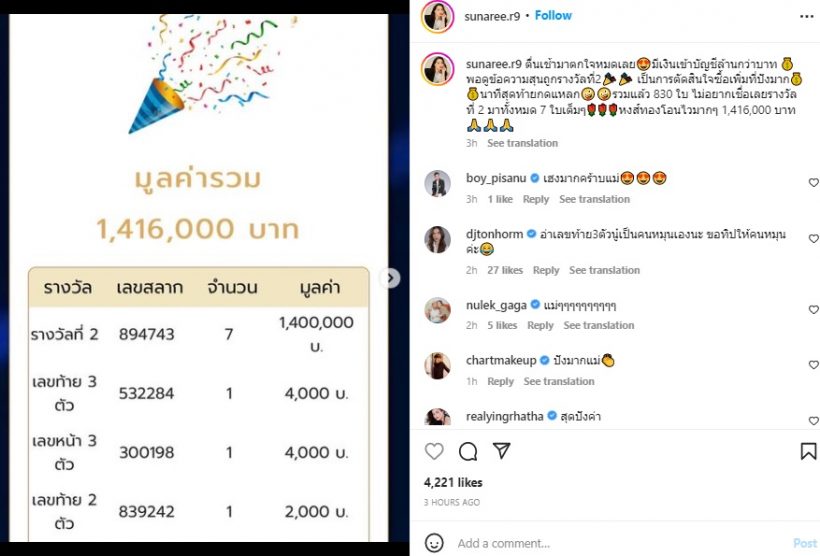 ล่าสุด “สุนารี” ได้โพสต์ลงอินสตราแกรมพร้อมข้อความว่า “ตื่นเช้ามาตกใจหมดเลย😍มีเงินเข้าบัญชีล้านกว่าบาท 💰พอดูข้อความสุนถูกรางวัลที่2🎉🎉 เป็นการตัดสินใจซื้อเพิ่มที่ปังมาก💰💰นาทีสุดท้ายกดแหลก🤪🤪รวมแล้ว 830 ใบ ไม่อยากเชื่อเลยรางวัลที่ 2 มาทั้งหมด 7 ใบเต็มๆ🌹🌹🌹หงส์ทองโอนไวมาก ๆ 1,416,000 บาท 🙏🙏🙏”